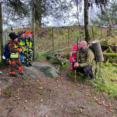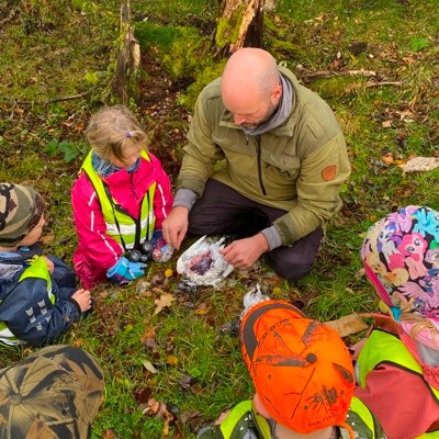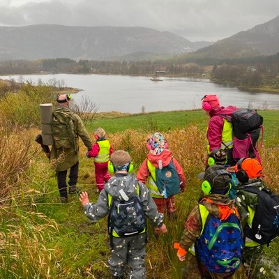 Med hørselvern klart og sekker på ryggen, møtte vi Line som også går på gul gruppe, og pappa Kristian som stod klar med kikkert og hagle på avtalt møtested. Det var Kristian som hadde inviter oss med på jakt, og barna hadde blitt godt forberedt og foreldrene informert med mulighet til å velge et annet alternativ for barna i barnehagen. Det ble fortalt om regler i forhold til våpen og hvilken funksjon jaktvåpen har.
