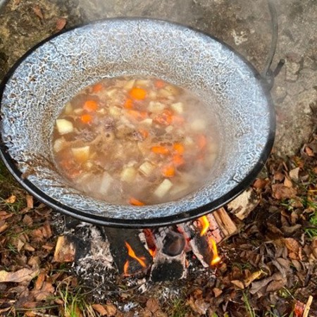 I sekken bar vi med oss grønsaker, ved og bålgryte, for selvfølgelig hører det med til en ekte jakttur å tilberede fangsten over et bål og å kose seg med et godt måltid.
